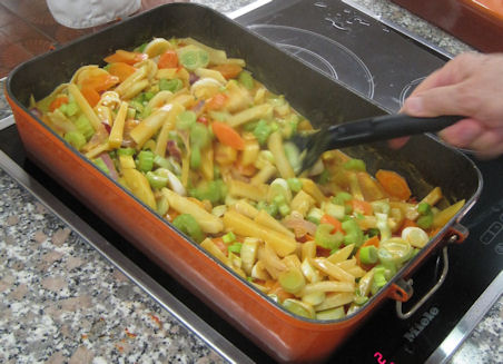 Mit Kokosmilch (ungesüsst) auffüllen und kurz aufkochen lassen. Rüebli, Steckrüben und Schwarzwurzeln hinzufügen und ca. 30 Minuten bei mittlerer Hitze zugedeckt garen